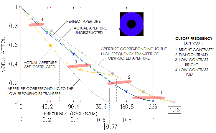 Here we see that the worst part of the central obstruction effect is lowering contrast transfer to the level of 33% smaller aperture in approximately 0-0.3 range of frequencies. In the 0.7-1 range the transfer increases to the level of 16% larger aperture, while over the 0.3-0.7 range we have transition from lower to higher transfer, extending all the way to the resolution limit of 16% larger aperture. Overall, nominal view favors obstructed aperture, which has contrast transfer advantage in nearly as much of the frequency range as the unobstructed, with extra high frequencies added beyond the resolution limit of unobstructed aperture. However, to better understand the implications, MTF frequencies should be associated with magnification. With the limiting resolution at cutoff frequency λ/D in radians (times 206,265 in arc seconds), magnification at which a general detail is magnified to 5 arc minutes (likely more near threshold of detection), needed for the average eye to recognize its shape is 300D/206,265λ, or 2.64D for the aperture diameter D in mm and λ=0.00055mm (67D for D in inches). For details of Airy disc size, 2.44λ/D, corresponding to 0.41 frequency, it is 1.1D, and half as much for twice larger detail (0.2 frequency). So we could say that high magnifications start, quite approximately, at 0.3 frequency. If so, the bad part of central obstruction effect falls to the range of mid and low magnifications, while the good part covers most of the high magnification range. That said, should be noted that the largest contrast drop for this obstruction, some 25%, is at about 0.4 frequency - somewhat deeper into the high magnification range - while diminishes toward the mid-to-low magnification range (<0.3 frequencies), down to 12% at 0.2, and 5% at 0.1 frequency. There are direct implications of different contrast levels on the limiting resolution. Taking approximate minimum contrast requirements for different object types from Rutten/Venrooij, we get that the obstructed aperture will have appreciably higher resolution limit not only for the conventional MTF limit (two bright lines, nearly identical to that for two near equally bright stars), but also for bright contrasty objects, like the surface of Moon (1 and 2, respectively). On the other hand, unobstructed aperture has higher resolution limit for bright low-contrast objects (3) and dim low-contrast objects (4). Obviously, we can't compare apples and oranges, so whether the effect of central obstruction is good, bad, or insignificant, will depend on the specific use. In all, the effect of central obstruction is a mixed bag, and certainly is not only bad. For photography, considerations are somewhat different, but the effect is generally considered less of a factor than for visual use. Summing it up, while it is not possible to execute the actual optics to its theoretical optimum, it is not even necessary. No mortal soul can see the difference of one or two 1/100s in the Strehl ratio. From Baril's article, it is very likely that his commitment to making this telescope as close to its design marks as he could, did bring it to the level where the difference vs. theoretical optimum didn't matter.
