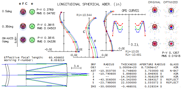 Marc Baril's 7" f/8 modified Sigler-Maksutov-CassegrainMaking Maksutov-Cassegrain of any kind is not for the faint of heart, primarily due to the full aperture Maksutov lens corrector, whose "easy" to make spherical surfaces have to remain within tight tolerances for the surface itself, the two surfaces relative to each other, and both relative to the meniscus thickness. A good example of it is Maksutov-Cassegrain made by Marc Baril, an amateur astronomer with professional background. Main modification to the Sigler's design was shortening the tube length which, according to Baril, did somewhat lower system's axial correction, but still allowed a high-level performance. Here is raytrace of the prescription given in the article.