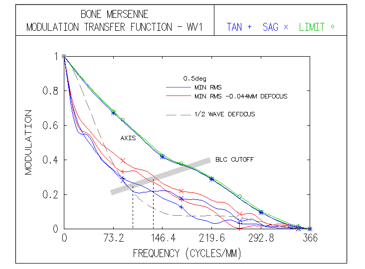 Note that even with OSLO making vertical shift adjustment, it is not the wavefront centered on the PSF peak, since it was looking for the "minimum RMS" error, and found it at an image point with still significant tilt error in the main, lower portion of the wavefront. If we manually enter -0.0002 shift - which should be equivalent of +0.0078 shift with respect to the default - we see interferogram nearly corrected for tilt and other aberrations (except a roughly 1/4 wave zone) in an area somewhat larger than with the "minimum RMS" focus corrected for tilt, which should be the reason for the higher PSF peak. But the P-V and RMS wavefront error are again larger for this point. This illustrates why both, nominal P-V and RMS wavefront error become less reliable indicators at large error levels. The "best focus" option is supposed to find what it promises, but it evidently doesn't always work as planned. Contrast transfer plots below show the defocused image at 0.5° as having appreciable higher contrast transfer than the "minimum RMS" focus. Note that these plots do include the effect of 20% linear central obstruction, omitted above.