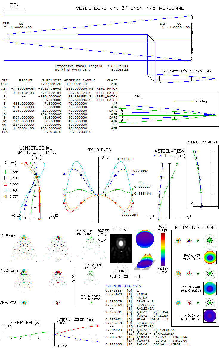 system, there is a price to pay. Clyde Bone Jr. 30-inch f/5 MersenneIn an S&T article from 1999 Clyde Bone (San Angelo, Texas) describes his 30-inch f/5 Mersenne-type telescope, for which he used Tele Vue's 140mm f/5 Petzval apo at the eye end (there is also an article on the Tele Vue site). The telescope was built with the highest standards, using, for instance, astro-Sital mirrors with 96% reflectivity - 1/16 wave primary, 1/10 wave secondary - and Pyrex flats with dielectric coatings (98.5% reflectivity). The two mirrors are confocal paraboloids, producing collimated beams free of aberrations (except Petzval image curvature, which is here -836mm). An image-forming system is required and, if the completed system is to be a visual telescope, it has to consist of an objective and eyepiece - i.e. telescope. Image below shows raytrace of such a system. Since no information on the Tele Vue refractor was published, a Petzval system that should be similar to it in its optical output is used to illustrate the combined performance level. It is a borderline "true apo" based on the errors in the four unoptimized wavelengths (F and C balance out at about 0.80 Strehl, and only the violet g-line is little over the required 1/2 wave P-V), but not according to its 0.917 polychromatic Strehl (photopic). This is mainly caused by keeping the violet g-line error nearly as low as possible, causing the blue and red - particularly the former - to be suboptimally corrected. If the F-line error is minimized, its Strehl increases to 0.856 (w/0.898 C-line), g-line drops to 0.183, but the poly-Strehl is up to 0.945 (all needed to accomplish this is to change R5 i.e. 9 in this prescriptionto 520mm, and R8 i.e. 11 to -237.7mm; that produces f/5.15 system, rescaling it to f/5 would lower the poly-Strehl to 0.934). The actual secondary is six inch in diameter, but in order to avoid stopping down the aperture, the reflected beam width has to be no more than 140mm (here, it is slightly less, which produces an effective f/5.1 system). Note that refractor alone is evaluated at f/5, and the setup used only stop at a distance of the Mersenne system exit pupil (located at -k+k2 from the secondary, toward primary's focus, in units of primary's focal length, with k being the marginal ray height of the axial pencil at the secondary, in units of aperture radius). Prescription with the complete system given with the image is a compilation of two prescriptions (OSLO Edu has 10-surface limit). This means that the nearly flat field here in the actual telescope corresponds (approximately) to the Petzval image surface, somewhat lessened by astigmatism induced by lens objective processing diverging pencils from the secondary (shown on astigmatism plots). Also, the 0.5° field radius in a 700mm f.l. refractor corresponds to 0.09° in the 3889mm f.l. system (will be explained ahead).