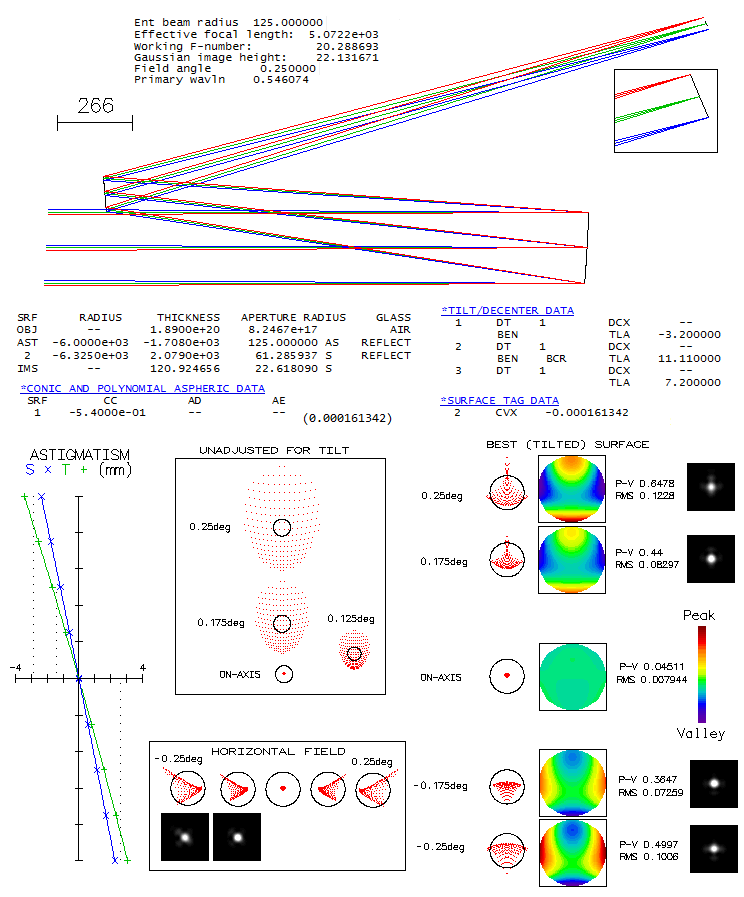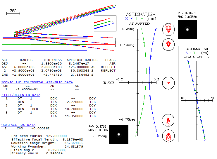 It shows that its maximum depth is less than 10 waves of 550nm light, i.e. that corrects mirror wavefront error 1.517 times smaller, around 6 waves P-V. The diagonal mirror is 55mm in diameter, taken as the size of central obstruction. Raytrace of this system below assumes perfect surfaces.
