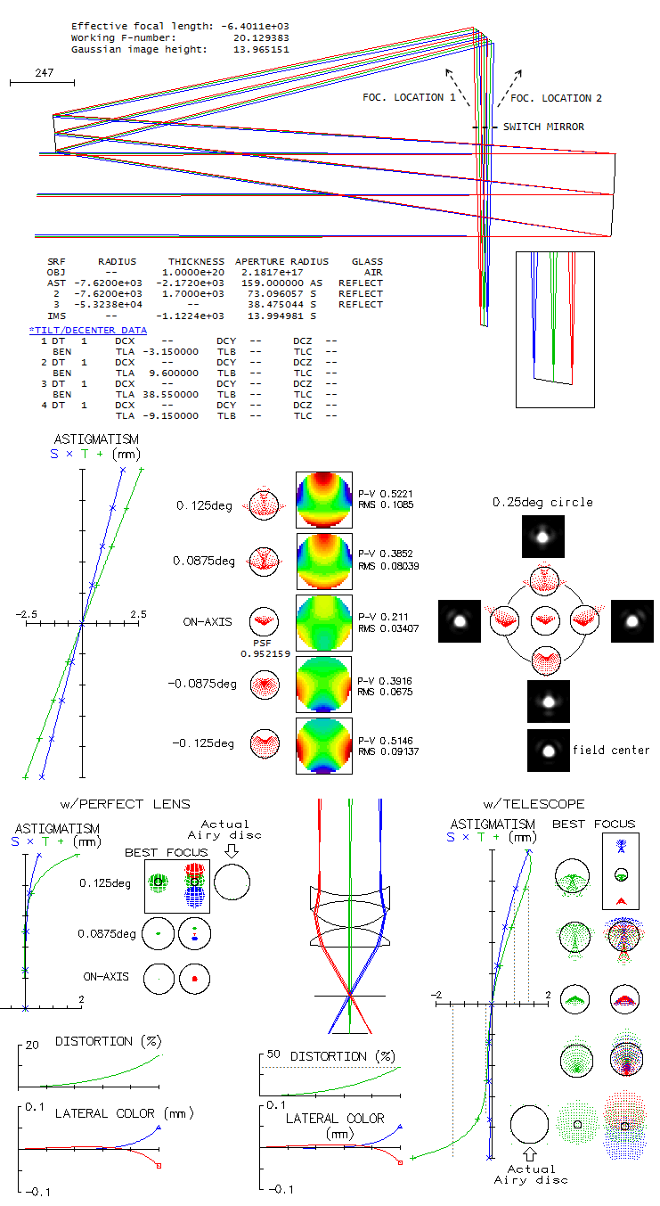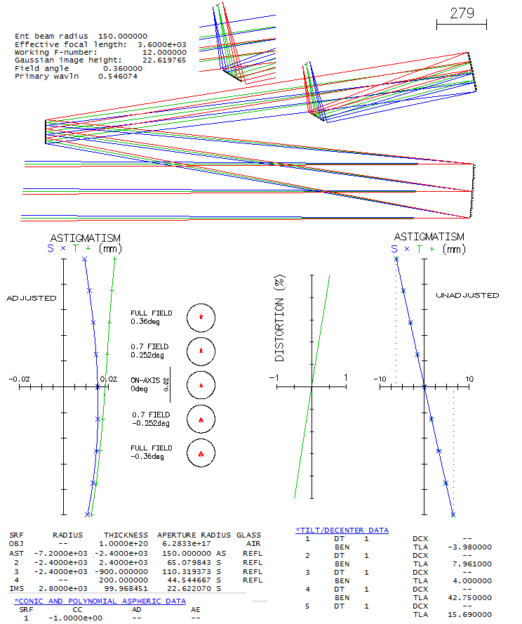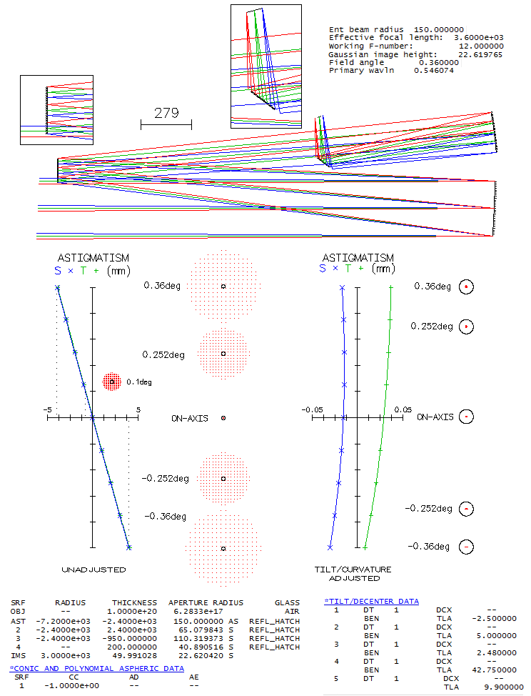 an f/6, or f/6.5 could do noticeably better in this respect than f/5. Terry Platt's 318mm f/21 Buchroeder "Quad-Schiefspiegler"Described in detail in Tonkin's "Amateur Telescope Making", this tilted-mirror system stems directly from Kutter's Schiefspiegler, with the third mirror added to cancel out astigmatism once the primary and secondary are arranged to cancel out coma (in the book it is called "quad-schiefspiegler" but since reflecting flat does not influence system output, it is a three-schiefspiegler). Reflecting flat is added in order to create two alternative focus locations, as indicated below. However, since it doesn't influence raytracing, and the telescope is fully operational without it, it was omitted from consideration. Primary mirror is aspherized (-0.55 conic) in order to minimize axial aberration, with spherical secondary and tertiary. Field angle is chosen to create image that fills out 1.25-inch barrel.