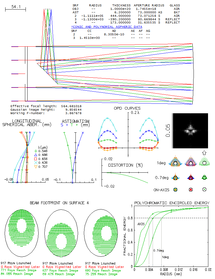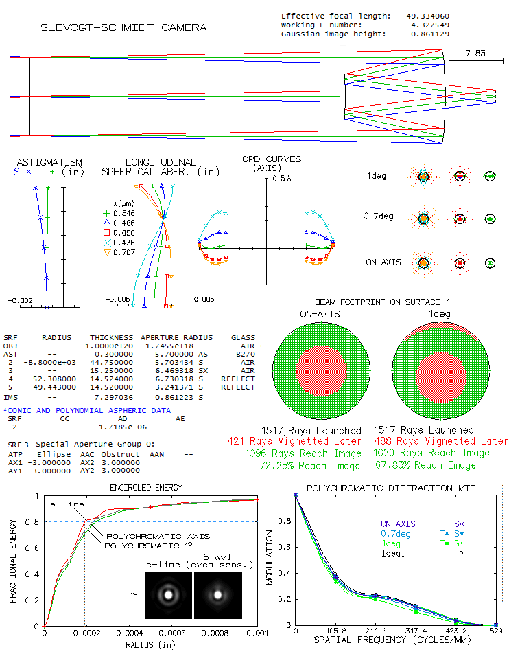 Due to the relatively slow focal ratio, chromatic correction is excellent, comfortably within the "true apo" requirements. The ray spot plots show residual coma (about 0.80 Strehl large at 1° off), but it is low enough not to significantly alter the shape of diffraction image (for fully canceling coma, either primary conic of 1.5, or corrector separation of 460mm are needed). The diagonal is not quite large enough to fully illuminate 2° field (it is raytraced w/o offset, but in the actual telescope is offsetted to be centered under the focuser). At the field edge, vignetting is about 10% (taken as that on the horizontal ends of the diagonal, the 3rd from left), which is within acceptable. Note that 711 out of 917 rays is what remains after central obscuration.