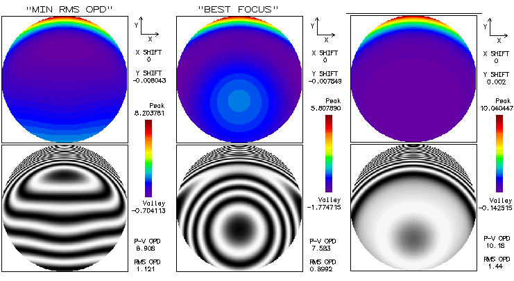 The field is limited to 0.5° i.e. 0.09° radius, since off-axis aberrations are already significant. It is a consequence of the widely separated aperture stop (also, as the box right from prescription shows, vignetting at the objective lens becomes significant). Part of it is that the incident ray angle is magnified after reflection from the secondary. With infinite secondary magnification, incident angle is magnified by a factor 1/k; with k=0.18 here, the incident angle magnification is 5.56, i.e. 1° angle at the primary becomes 5.56° at the lens objective. Hence, 0.5° at the lens objective is 0.09° in the actual system (linear field height is identical in both, since the two respective focal lengths differ by the same ratio). The central obstruction is 20% linearly, or little more. Since its effect on off-axis aberrations here is negligible, it is omitted to keep interferogram patterns intact. Also, to show the original polychromatic Strehl of the refractor, which would be superficially increased in the presence of obstruction (specifically, it would increase the poly-Strehl to 0.934 - and to over 0.95 with the F-line error minimized - as a result of small wavefront error decreases in all wavelengths - the larger error, the more - hence only in part reflecting better chromatic correction; on the other hand, that small gain is paid for with a 0.96 drop in central intensity - to the actual 0.897 - plus another 0.96 ratio energy loss due to the smaller central maxima, for the final 0.87 central maxima energy ratio on axis). Wavefont map for the 0.5° point shows that most of the P-V error comes from raised edge on one side. Because of that, both P-V and RMS error are somewhat misleading, implying larger than the actual error. The main wavefront component is in the blue area, less than 1/3 of the entire 8 wave P-V error. Zernike analysis gives as dominant terms primary coma (#6), astigmatism (#4) and defocus (#3), followed by secondary astigmatism (#11), coma (#13), primary spherical aberration (#8) and trefoil (#9). However, the primary spherical aberration term indicates 0.32 wave RMS, much more than what is present on axis; this means that most of this term is actually lateral spherical aberration, a secondary Schwartzschild aberration of the same form as primary spherical, but increasing with the square of field height. Also, raytrace shows that coma-like ray spot plot grows significantly faster than in proportion to field radius, indicating presence of other "odd" secondary aberrations, such as lateral coma (secondary Schwatzschild aberration, of the same form as primary coma, but increasing with the cube of field radius), and probably some others. Diffraction simulation for the 0.5° point (e-line) shows some elongation, but still well formed central maxima, embeded in a tight, bright ring (mostly due to 0.01 normalization); however, 80% energy radius is 0.0286mm (large black circle), much larger than the Airy disc (not sure how adequate is this number, since it could be based on PSF centroid location, which is here by some four Airy disc diameters - or 0.025mm - from the PSF peak, indicated by the dense ray area above the Airy disc circle on the ray spot plot). The bright central oval is similar in area to the Airy disc, but the peak intensity is only 0.40, indicating energy comparable to that with 1/2 wave P-V of spherical aberration (note that the peak intensity is much higher than central intensity, due to intensity shift from the PSF center). Box bottom right shows corresponding ray spot plots for the refractor alone, for the same 0.5° radius field; evidently, all off axis aberrations are a consequence of the large stop separation. There is a discrepancy between the 0.5° wavefront error magnitude and the corresponding PSF. Even if limited to the blue area on the wavefront map, it is as much as 2-3 waves P-V, not agreeing with still quite compact central maxima. Taking a closer look, we see that OSLO default wavefront map is for "minimum RMS OPD" (image below, left).