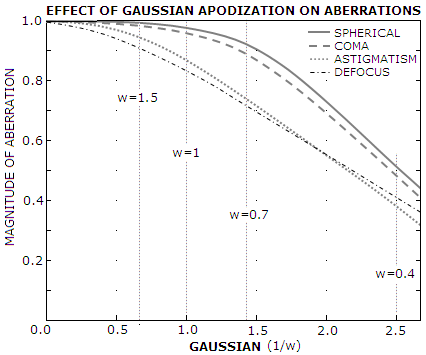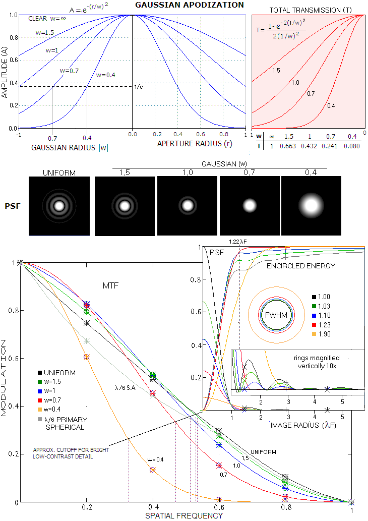 Gaussian amplitude profile over the pupil has full amplitude (A=1) in the center, decreasing toward the edge. The smaller Gaussian width w, the greater amplitude suppression toward pupil edge, the wider central diffraction maxima, and the fainter ring structure. Amplitude profiles and corresponding PSF simulations are shown for w=∞ (uniform transmission), 1.5, 1, 0.7 and 0.4. As the plots below show, ring structure is nearly non existent at w~0.7, and further suppression of amplitude in the outer area mainly achieves significant central maxima expansion. So for an apodizing mask of this type the optimum Gaussian radius is w~0.7. With incoherent light, total energy in the pupil - or transmission - is proportional to the amplitude squared. Squaring, in effect, produces a narrower Gaussian, whose volume vs. volume of the cylinder equals the transmission coefficient (top right). For w=∞, 1.5, 1, 0.7 and 0.4 total transmission is 1, 0.663, 0.432, 0.241 and 0.080, respectively.