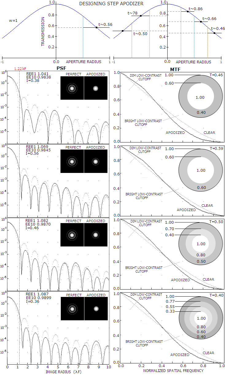 PAGE HIGHLIGHTS Apodizing, or change of aperture's transmission properties, also affects intensity distribution within the diffraction pattern it generates. The effect of apodization was mainly subject of speculations among amateur astronomers, until Harold R. Suiter published his book and articles, during the 1990s and at the beginning of this century, using diffraction calculation to find specific answers. This text uses his analysis and his diffraction program "Aperture", with somewhat expanded coverage of the effect of Gaussian apodization and potentially useful types of apodizing masks. There is a number of possible patterns of altering pupil light transmission. The starting point here is so called Gaussian pupil, where the change in wave amplitude over the pupil follows a Gaussian function (FIG. 111A).