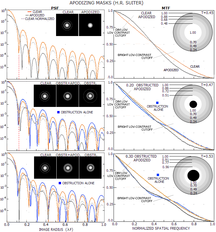 The contrast transfer consideration in FIG. 111A strictly applies to the standard MTF pattern, i.e. one with sinusoidal intensity distribution. In general, there is no major difference if square-wave pattern, with evenly bright and dark bars is used, except that contrast transfer for the latter is somewhat higher over the range of frequencies. It can be concluded that Gaussian pupil is more useful in observing low contrast detail, either bright or dim, since contrast gain due to it covers most of the resolvable range for this detail type. However, this gain is likely to come at a price of somewhat compromised threshold resolution for this type of details. Independently of its effect on contrast transfer, the effect of Gaussian apodization on suppressing diffraction rings - and primarily the first bright ring - is beneficial in resolving, or detecting faint companions positioned in the first bright ring of the principal star. Another benefit from Gaussian apodization is that it generally increases the tolerance for inherent system aberrations. In other words, it does reduce the negative effect of any given level of conic surface aberrations - spherical, coma, astigmatism - as well as the effect of defocus. In the systems with relatively significant inherent aberrations - particularly astigmatism - it can produce noticeable improvement in the performance level based on this factor alone. Apodization is even more effective in suppressing the effects of local/zonal surface errors affecting the extreme outer area of the wavefront , such as turned edge. And, it is always important to consider the actual conditions of use. As Suiter points out, seeing error generally worsens contrast and resolution in the high-frequency MTF range. In larger amateurs apertures, details in this range are observable only in a fraction of the time, at best (FIG. 92B). In such case, there is little or no harm from the nominal contrast drop in this range, but the advantage of improved contrast in the mid-to-low frequency range remains.