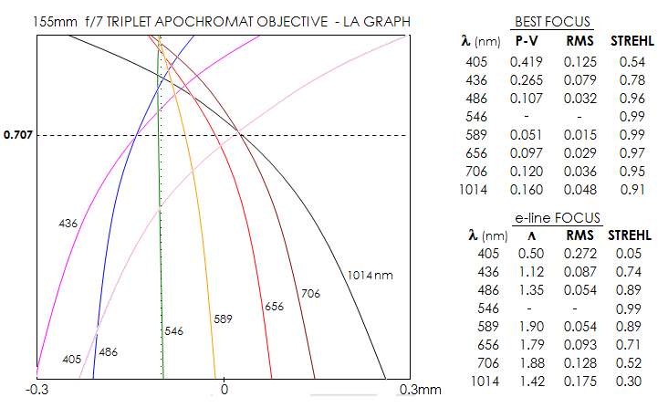 due to the very strong best image curvature. 60 - Astro-Physics 155mm f/7 StarFire EDFIntroduced back in 1993. this oil-spaced triplet (aspherised) uses FPL53 sandwiched between two unspecified crown glasses. It's been marketed as a telescope optimized for astrophotography, featuring 4-inch focuser and field flattener. Its prescription hasn't been published, but Company Seven did publish its LA graph, which can be used to extrapolate its color correction parameters. The original graph has somewhat rough, broken plots, so for the purpose of evaluating it a smoothly curved plots - as they are supposed to be - interpolated to the original ones are used (below). Due to aspherization, higher order spherical aberration is absent, and the longitudinal aberration (LA) for 4th order spherical are related to the corresponding best focus P-V wavefront error as P-V=LA/64F2. The error is four times larger at either paraxial, or marginal focus location, with the relative error magnitude (1 at the best focus) for any point in between given as w = [16 + 15Λ(Λ-2)]1/2, with Λ being the relative placement of the focus location within the longitudinal aberration normalized to 2 (i.e. Λ=0 for focus point coinciding with paraxial focus, Λ=1 for point midway between paraxial and marginal focus, and Λ=2 for point conciding with marginal focus). It is all that's needed for obtaining the coresponding best focus P-V wavefront error, which is for primary spherical 3.354 times larger than the RMS wavefront error, with the latter determining the Strehl ratio value. Error at the location of e-line focus is then obtained by using Λ value corresponding to that point for each wavelength. Error in the e-line is too small to be measured with sufficient accuracy (it is also low enough to be affected by the very low higher-order aberration residual), but its Strehl value is known, being specified as 0.99.