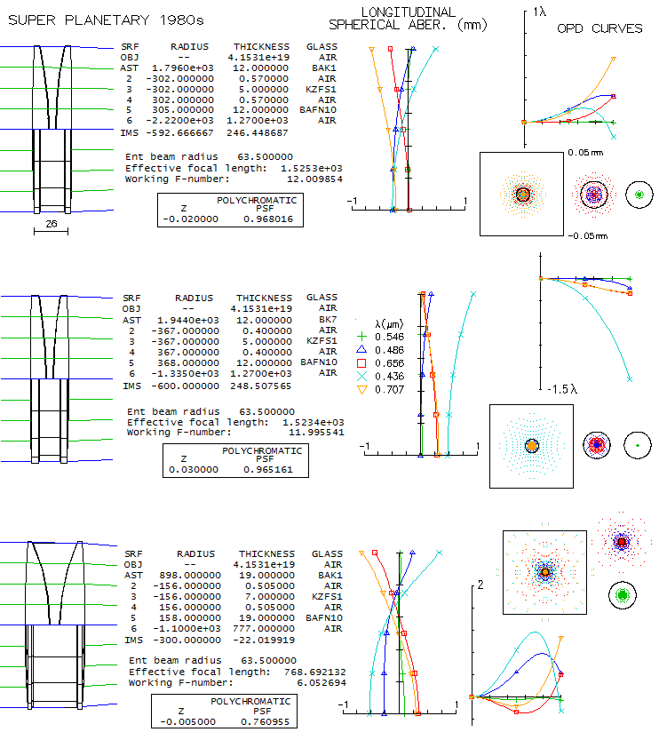 correction-wise between the two, even if one uses ordinary ED, and the other SD glass. 58 - Early Astro-Physics apochromatsEra of apochromatic telescopes in the US starts with Astro-Physics (AP) and Roland Christen. At that time, back in the 1980s, no today's extra-dispersion (ED) glasses where available, but were glasses with abnormal dispersion which was possible to use for a significant reduction in secondary spectrum, particularly with triplet objectives. Following information given in an article by Thomas Back (A Brief History of Astro-Physics Lenses, May 5. 1999.), several of these early glass combinations were raytraced, to find out how their level of correction - paricularly chromatic - compares to today's apochromats. All those objectives can be made coma-free, with similar, generaly low levels of off axis astigmatism and field curvature, so the results concentrate on axial correction. First models with specified glasses are from the period between 1981. and 1984. and relate to the "Super Planetary" series. They used either BK7/KzFS1(NASA)/BaF-10 or BaK1/KzFS1/BaFN10 combination (all Schott glass, except the NASA short flint KzFS1, a unique one-time production by Kodak/Baush&Lombard). There is no specific data on the NASA KzFS1 (it was made for NASA, hence the name); Roland Christen stated that it had better dispersion characteristics than the Schott version. The latter has significantly better performance, than a group of short-flint glasses that all share identical 613443 code (first three digits for the first three decimals after 1 in the index of refraction, and last three for the first three digits of their Abbe number). Despite sharing identical code, the difference in the blue/red and violet correction can be quite significant; for instance, the Ohara S-NMB51 would, in a 5" f/12 triplet have ~0.7 waves P-V in F and C, and over 3 waves in the violet g-line, while the closest to the Schott KzFS1, Corning FBC13-44, only comes to ~0.3 waves P-V in the blue and red, and ~2 waves in the violet (compared to less than 0.2 wave P-V in F/C and ~1.45 wave in the violet, as shown below).