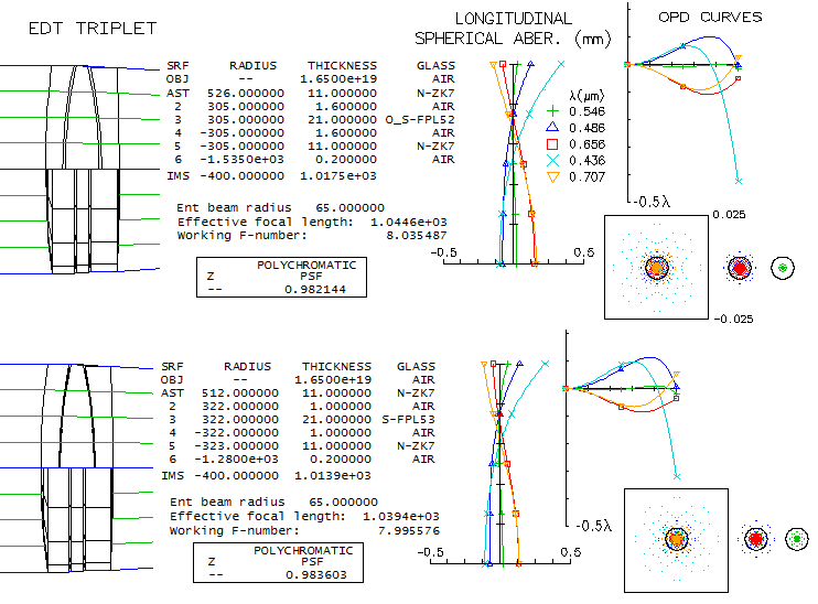 14-CFF 200mm f/6.5 APO TRIPLETWhat is known about this triplet is that uses Ohara FPL55 ED glass, and that has at least one aspherized surface. This means it can't be presented as the actual combination, but the choice of mating glasses is limited, due to FPL55 having lower relative partial dispersion (RPD) than other ED glasses, hence very few potential matching glasses for no appreciable secondary spectrum. The most likely choice is the cheapest, and also of the highest optical quality, S-BSL7, Ohara's equivalent of the Schott BK7. Image below shows BSL7/FPL55/BSL7 triplet with both, air and oil filled gaps (Schott K7 acts as oil substitute, having similar refractive index). Evidently, unlike the air-spaced lens, which has no noticeable higher-order spherical residual, in the oiled lens it is readily noticeable (the only difference in prescription, other than the gap medium, is the significantly stronger aspherization required with oiled triplet, mainly due to more 4th and 6th order spherical aberration at the 4th radius, as well as change of R1 to 644mm, to optimize color correction). Hoewer, it is a slight negative only in the optimized wavelength, while improving a bit the overall color correction - as the polychromatic Strehl (air-spaced graphs/spots are on top, oiled below).