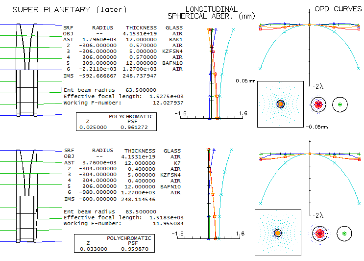 The BaK1/KzFS1/BaFN10 is unusual in that has better correction in the violet than deep red. Both combinations are comfortably above the 0.95 polychromatic Strehl (430-670nm, photopic) at f/12, although falling a little short in the "true apo" requirement that deep red and violet need to be less than 1/2 wave P-V (both lines have very low sensitivity in the photopic mode, and have little influence on the polychromatic Strehl; they, however, become more significant in typical field conditions, when eye sensitivity shifts toward mesopic mode). Note that the KzFS1 is the Schott variety hence the triplet using BK7 - the actual AP objective - has a better correction than shown. At f/6, correction level expectedly drops, but not far from "diffraction limited" in its design limit. Later versions of the Super Planetary used as the abnormal glass Schott KzFS4, either with BaK1 or K7 for the front element. Correction level is nearly identical with either, with a small difference coming from a slight change in the positive-to-negative power balance. While the error in violet is far too large to satisfy the P-V requirement for a "true apo", the polychromatic Strehl at 0.96 is more than high enough for it.