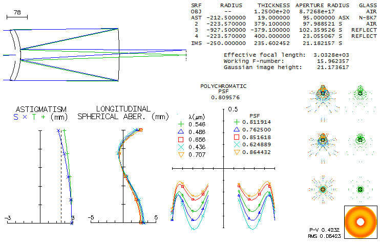 At its design limit, central line Strehl is 0.97, and polychromatic Strehl (photopic, 430-670nm) is only slightly lower at 0.969, implying practically zero axial color error. The 0.46mm longitudinal astigmatism at 0.5° off axis implies 1 wave P-V wavefront error, resulting in a cross-like diffraction image. Best image curvature seems exeptionally strong at -64mm radius, with the corresponding 0.5mm longitudinal displacement from axial focus for this zonal height converting to 5 diopters accommodation requirement with 10mm f.l. eyepiece (infinity to 0.2m). Since a standard 10mm f.l. eyepiece has about that large linear field, it would be barely passable for most people, and wider-field units would require even more accommodation. Partial accommodation would result in a more or less vertically elongated star image. With 20mm f.l. standard eyepiece, field displacement is four times larger, with the accommodation requirement also 5 diopters (with diopter of accommodation closely approximated by f2/1000). This, of course, neglects astigmatism and field curvature of the eyepiece itself, which can significantly change the final best image field curvature.