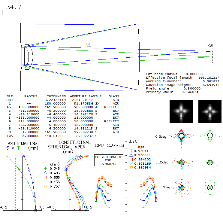 For those like me, curious about what just about any telescope actually delivers, not so much because of the quality concern, but more to find out how it actually works (without breaking it open to look inside :), that is just a treat hard to resist. The raytrace program used is OSLO EDU.