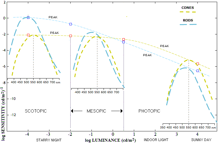 As plots above indicate, peak sensitivity for either cones or rods is nearly constant, about 555nm for the former, and 510nm for the latter. Every whole number increment indicates 10-fold difference in sensitivity. Thus sensitivity toward the ends of visual spectrum for either receptor type is a small fraction of their peak sensitivity. At the upper mesopic limit, cone function is still dominant, hence acuity and color response are nearly as good as in photopic mode. At the lower mesopic limit, however, rod function is fully dominant, acuity is poor and color response nearly non-existent.