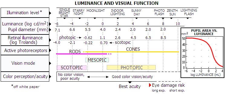 Note that there is no general agreement on the illuminance level that effectively inactivates cones or rods. Estimates of the mesopic range vary by tenfold, or more, on both, low (0.001 vs. 0.01 cd/m2) and high end (0.6 vs. 10 cd/m2 or even higher). Two recent models are fairly close in their estimate of the low end (~0.01 cd/m2, or somewhat lower, depending on the type of light), but not at the high end: one puts it at about 0.6cd/m2 (X-model, Rea et al. 2004, based on results of He et al. 1997/8), and the other at 10 cd/m2 (Mesopic Optimisation of Visual Efficiency, or MOVE model of the European research consortium, Eloholma and Halonen 2006). Several others, mainly compromising models also have been proposed. It is helpful to clarify some basic terminology related to this subject, since it can be confusing. While the physical light intensity is measured with radiometric units, its human perception is subjected to eye's selective reaction to it, which is measured in photometric units. The basic radiometric unit is watt (W), and photometric candela (cd), with the latter defined as the luminous intensity produced by a monochromatic light source emitting radiant (photon) flux of 1/683 watt at 555nm into the solid angle of 1 steradian (sr). The original definition of one candela (which was called candle, or candlepower) was the light intensity emitted by a plumber's candle made to specified standards. Closely related to candela is the luminous flux unit, lumen (lm), defined as a flux (i.e. photon density) corresponding to 1cd of luminous intensity (thus, 1cd=1lm/sr, and a point radiating freely at 1cd luminous intensity produces a 4π lm luminous flux). And the illuminance unit lux is defined as 1lux=1lm/m2.