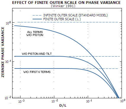 infinite OST, and generally negligible in comparison. In good seeing, when the OST can be expected to be in the 50-100m range, this reduction ratio would, correspondingly, apply to 50-100mm aperture diameter. But at these aperture sizes the tilt component is not a significant error source in visual observing. However, a hundred times smaller aperture is still within the amateurs range. In a 0.5m aperture, with the good seeing r0 of around 10cm, D/r0~5 and the long-exposure phase variance 1.03(D/r0)5/3 being the standard deviation 2πφ squared - φ being the phase analog of the RMS wavefront error - the variance is 3.94 and the corresponding RMS wavefront error is 0.32. At this D/r0 level, most of the tilt component is effectively in the visual seeing error; taking that 2/3 of it is, and knowing that the tilt component makes 64% of the entire (long-exposure) seeing error gives that 40% reduction in the tilt error indicated by the plot for D/L=0.01 results in some 22% smaller RMS wavefront error. Specifically, 0.2 vs. 0.25. For the long-exposure error, the reduction is from 3.94 to 2.36 in the variance, hence from 0.32 to 0.24 in the RMS (since 2π is a constant, the RMS changes as the square root of the change in variance). The roughness component of the seeing error, i.e. the error remnant with the tilt removed, is much less sensitive to the use of a finite OST in calculation. The difference becomes significant only at D/L~0.1 and larger, and at even larger D/L values when the first 6 Zernike terms (Noll's scheme) - piston, tilt (horizontal and vertical), defocus and astigmatism (horizontal and vertical) are removed. The effect of a finite OST on the Kolmogorov-based Zernike wavefront decomposition is a reduction in the error as a whole, reduction in the relative contribution of the image motion component (tilt terms) and increase in the relative contribution of the roughness error component. Specific ratio of motion vs. roughness component depends on the aperture-to-OST (D/L) ratio: larger ratio values result in the relative increase of the roughness component. At D/L~0.001, the error is reduced by about 20% which, with all of it coming from the reduction in tilt (image motion) contribution, increases the relative roughness variance component from 0.134 to about 0.16 (i.e. the roughness RMS wavefront error component from 36% to about 40%). At D/L~0.01 and 40% error reduction, still entirely due to the smaller tilt component, the relative roughness component in the error increases to ~0.22 (~46% of the RMS error), and so on. Other authors had also addressed this issue. An interesting angle is the effect of finite OST on the seeing FWHM (On the Difference between Seeing and Image Quality: When the Turbulence Outer Scale Enters the Game, Martinez et al. 2010). As shown on the graph below, a finite OST results in a smaller seeing FWHM, the smaller OST, the more so. Similarly to Winker's modeling, limiting the maximum OST size takes out significant portion of large-scale contributions to wavefront disturbances due to turbulence, hence most of the resulting error reduction is in the tip-tilt component, i.e. random motion of image as a whole. The degree of FWHM reduction vs. Kolmogorov (infinite OST) model due to it is approximated (Tokovinin, 2002) based on the von Kārmān finite-OST turbulence model.