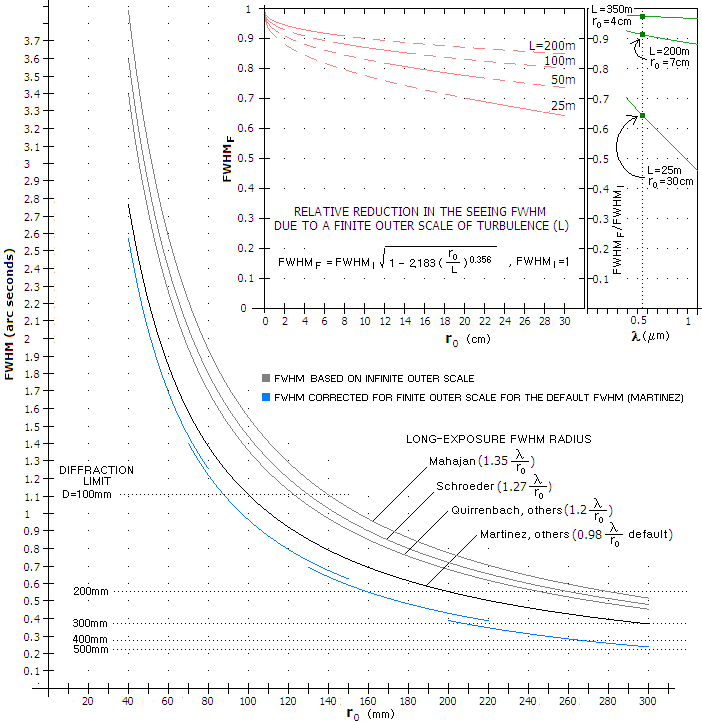 The "default" seeing FWHM for the Kolmogorov model, FWHMI=0.976λ/r0 (used in Martinez et al.) is for λ=500nm and zero zenith angle, is valid under assumption of an aperture infinitely large vs. r0 which, again, is not fulfilled in field conditions (obviously, since it would imply seeing FWHM for D=r0 slightly better than with zero image motion). For large ground telescopes, r0 is not negligibly small and the resolution (theoretical seeing FWHM) is somewhat worse. The most frequently quoted figure is 1.2λ/r0, and the calculation specifically addressing the seeing FWHM in the proximity D=r0 gives long-exposure FWHM as 1.35λ/r0 radians (i.e. 206,265 as many arc seconds). The graph shows the reduced FWHM (FWHMF, with the subscripts "F" and "I" referring to finite and infinite OST, respectively) vs. "default" Kolmogorov FWHM (blue vs. black), but it is fair to assume that the relative reduction (top left) would be similar for other FWHM modes as well. Since OST size generally increases with turbulence - or, rather, the other way around, as more energy is injected into the air - the reduced FWHM is plotted for four arbitrary, partly overlapping ranges with the averaged OST values from 200m, roughly corresponding to the average ~2 arc second seeing, to 25m, roughly corresponding to 0.5 arc second seeing (more accurate plot would have been the one interpolated through the blue graph segments). Graphs indicate that the nominal FWHM reduction due to finite OST decreases, and its relative reduction increases with better seeing. The reduction shown on bottom and top left is for r0 values in the visible range of wavelengths (centered at ~550nm). Since r0 varies with the wavelength, as λ1.2, FWHM reduction due to finite OST increases into the infrared, the smaller OST the more so. For instance, if the relative FWHM reduction (top right) is for r0 values for λ~550nm, going to λ~1μm would result in about twice larger r0, and the reduction given by the relation for r0~200mm at λ=550nm (i.e. ~400mm at λ=1μm) and L~25m would have been 0.5, about 40% greater than at 550nm. Top inset at right (green) illustrates the range and dynamics of FWHM reduction in a wider spectral window, from 385 to 1100nm. The reduction is always greater for longer wavelengths. However, it is near negligible in poor seeing (top), quite modest in the average seeing (middle), while becoming significant in excellent seeing (bottom).