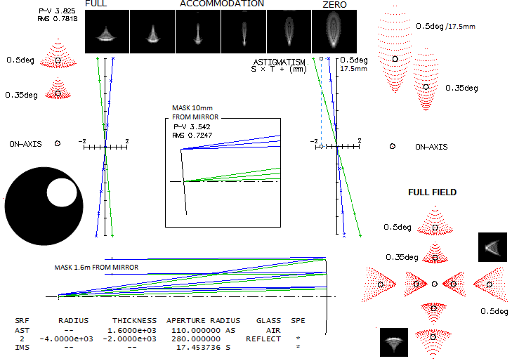 of this kind. EFFECTS OF OFF AXIS MASK With off axis mask on, light effectively uses off-axis section of a paraboloid. This causes: (1)reduction in the level of off axis aberration, which is also from dominant coma transformed to dominant - although still somewhat coma-like in appearance - astigmatism, and (2) tilted best image surface. In the case shown, a large 560mm f/3.6 mirror, with a 200mm mask opening, tilt is significant enough to cause deformation of the diffraction image farther off axis (1.5mm of tilt-caused defocus at 17.5mm radius corresponds to 100mm field curvature radius, thus requires significant eye accommodation). The field is also asymmetrical, with the astigmatism along the tilted (vertical) radius having different form than along the horizontal field radius.
