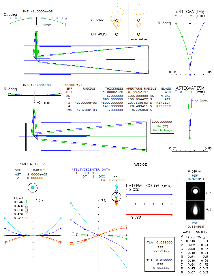 Mask distance has a minor influence on the magnitude of off axis aberration. Since this astigmatism originates in the mirror coma, it also changes with the field radius. Placing mask farther away increases the chief ray height at the mirror, increasing by it off axis error. As a relative aberration, in units of the aberration with the mask at the mirror surface, the increase is approximated as 1+αS/[29(D-M)], where α is the off axis angle in degrees, S is the mirror-to-mask separation, D is the mirror diameter and M is the mask opening diameter. In this case, α=0.5, S=1600mm, D=560mm, M=200mm, and the relative aberration is 1.077 times larger than with the mask at the mirror. OPTICAL WINDOW EFFECT While not widespread among amateurs, and pretty much ignored by the commercial makers, sealing off a tube of the Newtonian by placing optical window on its front end seems to keep its appeal for at least a few. The benefits are avoiding spider vanes diffraction and protecting the tube inside and primary from dust and impurities contained in the air. Does such window produce optical effects, and how accurately made it needs to be in order not to induce significant aberrations? To find the answers, will raytrace a 200mm f/5 Newtonian (below). Configuration is more or less standard, and small differences will not significantly effect results. Unavoidable effect, which is not even caused by the window itself, rather by placing aperture stop at a distance from the primary mirror, is change in off axis astigmatism, and wit it in the field curvature. As raytrace for arrangements without (top) and with optical window (below it) show, stop shift significantly reduced astigmatism, making best image surface somewhat more relaxed, and with the curvature of opposite sign than that with the stop at the mirror. While in the latter best image radius (absolute value) equals mirror's focal length and is concave toward mirror, with the window on best image radius is 1370mm, convex toward mirror (if astigmatism would go to zero, image field radius would equal Petzval curvature, i.e. one half of the mirror surface curvature radius. With the new stop location, longitudinal astigmatism at 0.5° is reduced from nearly 0.08mm to 0.012mm (since the P-V error is - same as for defocus - smaller by 8F2, from 0.7 to 0.1 wave P-V, respectively, for 550nm wavelength). Despite the significant reduction in astigmatism, off axis blur at 0.5° is little changed, due to the coma accounting for most of the blurring (about 2.4 waves P-V). If the window clear opening equals that of the mirror, some vignetting is induced: less than 6% at 0.5° and twice as much at 1° off (for zero vignetting, mirror radius needs to be 7.5mm/15mm larger).