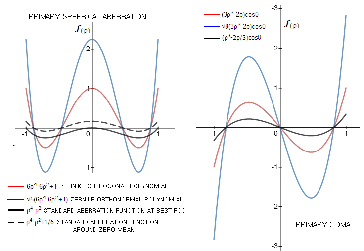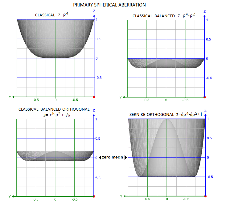 As mentioned, zero mean is defined as a surface for which the sum of wavefront deviations to either side is zero. That is important conceptual difference vs. standard wavefront error, which expresses deviations from a reference sphere (also commonly constructed as a circle). Hence the polynomial, which is a product of its radial variable in ρ and angular variable in θ, has zero value at the intersection of the wavefront and its zero mean. Zero mean differs from the reference sphere for balanced primary spherical aberration and defocus, while coinciding with it for balanced primary astigmatism. coma and balanced 6th/4th order spherical (FIG. A, 2). As a result, the form of polynomial is different from the classical aberration function for the former three, while identical (except for the normalization factor) for the latter two.